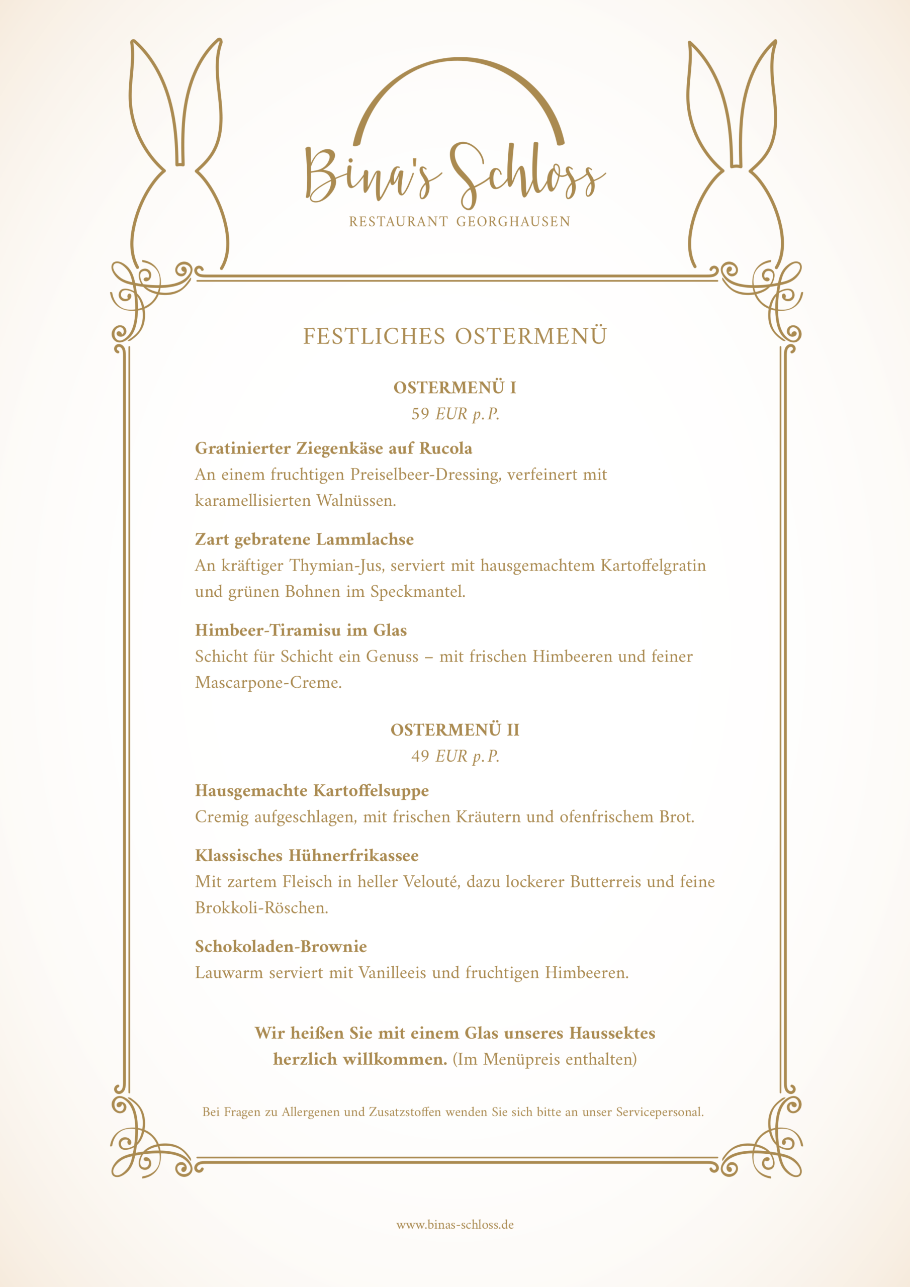 Der Abend beginnt um 17:00 Uhr mit einem Glas Haussekt, zu dem wir Sie herzlich einladen. Ab 18:00 Uhr servieren wir unser Ostermenü.